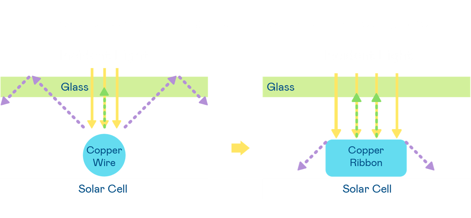 • 電池使用多條銅導線 (Copper wire) 於電池片上形成較短的電流路徑,提高電流收集效率,採用圓形設計的銅導線較傳統扁平式的銅焊帶 (Ribbon),可增加入射至電池的光線量。